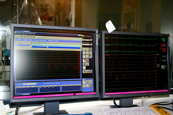 Hinter den Patienten rechts Monitor des automatischen Kontrastmitteleinspritzsystems, links Monitor zur Messung des Flusses in den Koronararterien (FFR)